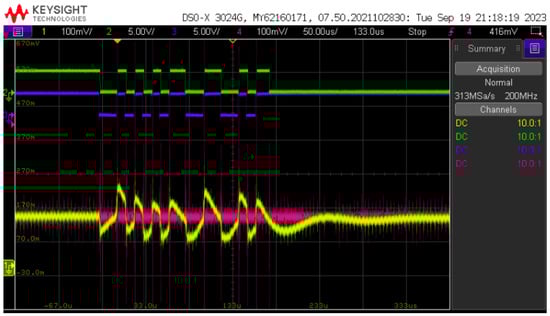 It is possible to observe that the system presents a flat response and zero phase at the bandwidth of interest of the communication signal. For the interference caused by the PWM, the system acts as a low pass filter with a starting attenuation of approximately −50 dB at the frequency of 10 kHz; therefore, it fulfills the objective of the diplexer circuit of coupling both communication signal with only the average value processed by the converter.