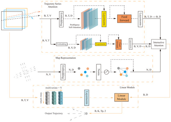 First, we extract the trajectory information of the agents from the scene data, use the relative position to represent the geometrical attributes of the agent’s trajectory, and when the length of the agents’ trajectory sequence is less than the historical time step, fill it with the value 0 and mark the filled elements with a mask. The trajectory series attention module uses variables at the same moment as tokens in extracting dependencies between sequences and uses linear layers to transform the variables to a higher dimensional space, and then models the temporal dependencies using the sparse self-attention mechanism [10] with the following formulas: