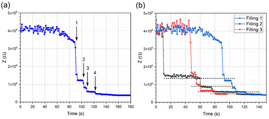 The step-like decreases in impedance when fluid fills the channels and connects the parallel electrodes (a). Arrows indicate the steps caused by the fluid sequentially flowing over each of the four individual electrode pairs, thus increasing the conductivity of the system. Repeated fillings show the stability of the characteristic impedance values indicated by dashed lines (b).