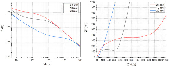 Concentration dependence of the impedance spectra measured in different dilutions of PBS. The Bode (left) and Nyquist (right) plots show the difference in conductivity of the dilutions.