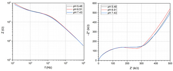 Investigation of pH dependence for PBS with different pHs shown on Bode (left) and Nyquist (right) plots. The Au electrodes show no significant pH dependence.