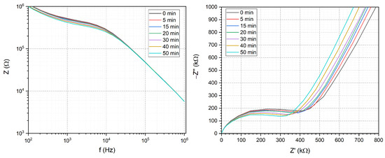 The stability of the system was investigated for 50 min continuously. There is a slight decrease in impedance due to the evaporation of the solution as represented by the Bode (left) and Nyquist (right) plots.