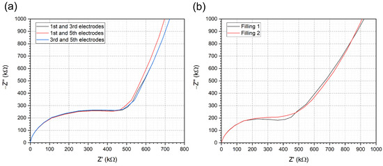 To examine the reproducibility and the stability of the system, measurements were performed with repeated filling while observing the EIS spectrum for a longer period of time. The EIS spectra were recorded with 5–10 min time differences (Figure 5). The impedance spectra slightly change in the low-frequency region (under Hz) in the first 10–15 min, due to the stabilization of the electrical properties of the system. With time there is a slow decrease in impedance owing to the evaporation of solution from the microfluidic chip; otherwise, the system is stable within a maximum of 20% deviations on the time range of the standard measurements and up to 10% under 30 min. A comparison of EIS spectra of three different electrodes yielded stable results. Here, the first, third and fifth electrodes were each coupled and their EIS spectra were examined. Then, the capability for repeated usage was investigated by measuring the the same chip after direct refilling (Figure 6). In both cases, the EIS spectra show reproducibility.