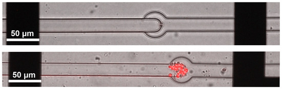 To validate the ability of the analytical system to screen localized cells in the microfluidic structure, S. cerevisiae yeast cells were trapped in the channels and their effects on the EIS spectrum were characterized. A yeast solution was prepared in PBS with 0.05 mg/mL concentration. This concentration yields around yeast cells per mL which is the optimal concentration to trap individual cells in the narrowing microfluidic channels (Figure 7). The number of successfully trapped cells was identified with a Zeiss AxioVert A1 inverted fluorescent microscope equipped with a Zeiss Axiocam 506 mono microscope camera (Zeiss, Oberkochen, Germany) connected to the Zeiss ZEN 2.6 (blue edition) image processing software. Propidium-iodide staining was applied to follow the changes in the viability of the cells (Figure 7) which was monitored by fluorescent microscopy using Cy3 fluorescent filter set (ex. 554 nm, em. 566 nm) for illumination and detection.