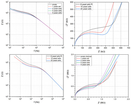 The recorded EIS spectrum was fitted with the described Randles cells and the corresponding parameters were derived which are the resistance of the (extracellular) solution (), the charge transfer resistance (), the double layer capacitance () and the CPE (Q). The experienced effect of the trapped yeast cells on the impedance spectra is in good agreement with the literature [32]. Apart from the mentioned parameters, the cell membrane capacitance () can also characterize the state of cells at high frequencies [14,33,34]. However, in our measurement setup we do not have the appropriate frequency range for examining the influence of to the spectra. The characteristic parameter that significantly changes when different numbers of cells are trapped between the electrodes is . This charge transfer resistance corresponds to the transmembrane ion exchange between the solution and the cell cytoplasm increasing the conductivity of the electrical double layer on the electrode surface by ion adsorption [32,35]. The fitted values and the errors of the fitting for in both cases are shown in Table 2. The results using individual electrodes show close to linear behavior in values; however, the measurements were hindered by the fact that during the filling protocol, we have no accurate control over how many cells are trapped in which of the channels. In the case of the connected electrode configuration, the offset of charge transfer resistance was decreased due to the parallel microfluidic channels. The modified Warburg impedance (CPE) was elevated due to the increased electrode surface—compared to the single electrode system. In the case of the modified solution composition (additional glucose and propidium-iodide staining when eight cells were analyzed) in Figure 9 a slight change in the solution resistance () was experienced.