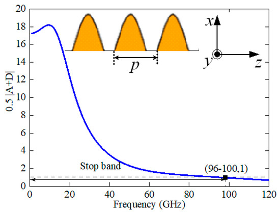 The model is shown in Figure 2 for analyzing the sine unit cell with p = 0.4 mm, m = 0.6 mm, n = 0.2 mm, and l = 0.7 mm. The ABCD matrix of the unit cell can be extracted from the HFSS simulated data. The simulated value of 0.5|A + D| is shown in Figure 3, indicating that the stopband is from DC to 96 GHz (where 0.5|A + D| ≥ 1). This corroborates the bandstop characteristics exhibited by the sine unit cell of the transmission line within the DC-96 GHz frequency range, effectively mitigating the leakage of waves outwards.