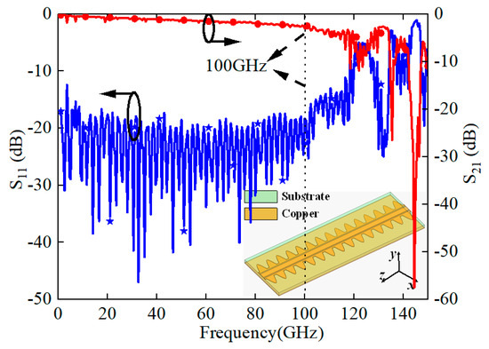The structure was solved for the S parameters by the HFSS, which has an enormous insertion loss (S21) above 100 GHz, as shown in Figure 4. This observation aligns with the conclusions drawn from Figure 3, underscoring the bandstop characteristics inherent to the sine unit cell of the transmission line.