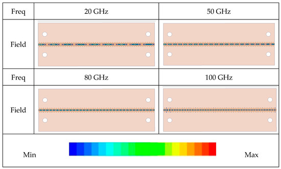 The electric field distribution from 20 GHz to 100 GHz is shown in Figure 5, demonstrating that the field is well constrained in the middle of the CBCPW-SE as the frequency increases. In addition, it can propagate the quasi-TEM mode. Therefore, the periodic sine of the edges blocks wave leakage, which is like an equivalent “metal wall”. The field distribution of the transmission line is consistent with the aforementioned bandstop characteristics inherent to its sine unit cell.