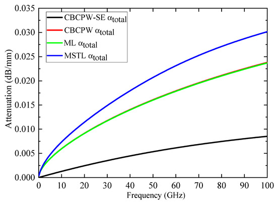 Comparison of the attenuation constants of the proposed CBCPW-SE, CBCPW, ML, and MSTL.