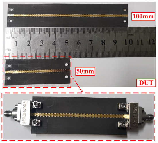 To further verify the performance of the proposed CBCPW-SE experimentally, we measured the fabricated CBCPW-SE sample shown in Figure 8 using the Ceyear 3672D vector (Ceyear China, Qingdao, China) network analyzer (VNA). The operating frequency band ranged from 10 MHz to 100 GHz. For the 10 MHz–50 GHz measurement, two 2.4 mm coaxial cables connected to the VNA were fixed to the device. The VNA was used along with 50–75 GHz and 75–100 GHz extending modules to perform measurements from 50 to 100 GHz. The transitions, including at the waveguide to coaxial connectors and the 1 mm end launch insertion loss, cannot be eliminated by calibration, so we fabricated and measured two lengths (50 mm and 100 mm) to obtain a differential insertion loss (with a measurement of |100–50 mm|). Differential calculations were required to measure the insertion loss and group delay (with a measurement of |100–50 mm|).