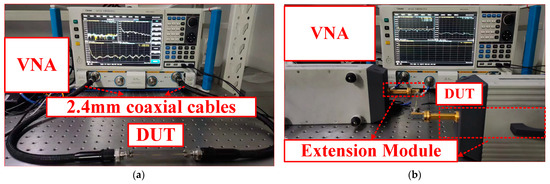 Photograph of the measurement process: (a) devices under test (DUTs) from 10 MHz to 50 GHz; and (b) devices under test (DUTs) from 50 to 75 GHz and from 75 to 100 GHz.