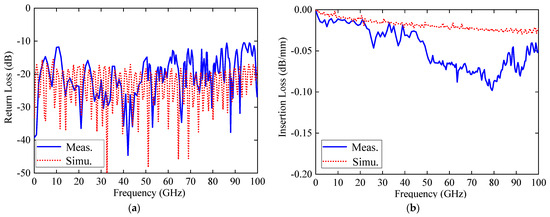 The simulated and measured reflection and transmission coefficients are displayed in Figure 9. The Huray model with a Hall–Huray surface ratio of 0.5 and a nodule radius of 1.8 μm was employed to simulate the influence of surface roughness [17]. It showed that both the simulated and measured S11 are less than −10 dB in the frequency range from 10 MHz to 100 GHz. Furthermore, both the simulated and measured S21 are larger than −5 dB with a length of 50 mm (with a measurement of |100–50 mm|), and a measured insertion loss lower than 0.1 dB/mm from 10 MHz to 100 GHz is achieved, as shown in Figure 9b. The small discrepancies between the simulated and measured insertion losses across the entire frequency range can primarily be attributed to measurement and fabrication errors. Furthermore, the inevitable introduction of the metal’s surface roughness during the PCB fabrication may also contribute to these differences. Return loss (S11) is included with various transition connectors during the measuring process. The deterioration of S11 is mainly due to the loss from the transition connectors.