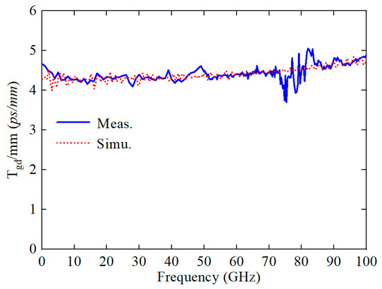 Figure 10 shows that the CBCPW-SE supports wave propagation with a low and flat group delay (Tgd). Specifically, the group delay per unit length is 3.4–5 ps, ranging from 10 MHz to 100 GHz.