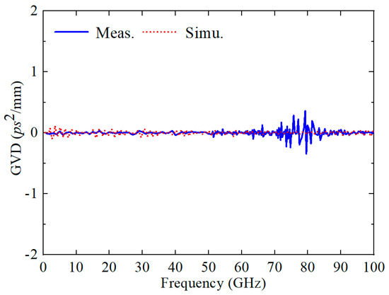 To delve deeper into the dispersion properties of the CBCPW-SE within the broadband regime, we undertook a rigorous analysis by computing the group velocity dispersion (GVD), as depicted in Figure 11. The GVD values, which are proximal to zero across the entire frequency band, underscore the exceptional low dispersion nature of the structure. This feature is crucial for preserving signal integrity and minimizing distortion in high-speed signal transmission systems. In general, the experimental outcomes align well with the predictions derived from the simulations, reinforcing the validity of our design and analysis. However, a marginal discrepancy in magnitude can be attributed primarily to the inherent limitations in the measurement process and the fabrication tolerances, which are common challenges encountered in the realization of microwave and millimeter-wave components. Nonetheless, these findings underscore the robust performance and potential of the CBCPW-SE for applications requiring precise control over wave propagation characteristics.