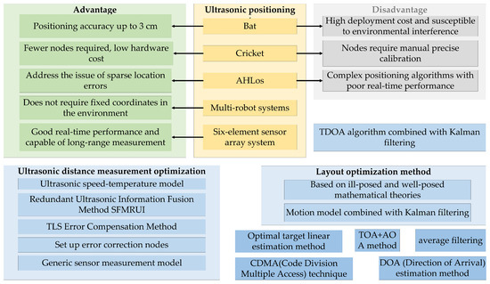 The development history of ultrasound is shown in Figure 3. Since the development of the Bat system by AT&T Labs in 1999, ultrasonic technology has been widely applied in indoor positioning. The Bat system utilizes ultrasonic transmitters, receivers, and a master server to locate moving targets by periodically emitting signals, achieving an accuracy of up to 3 cm. However, ultrasonic signals are susceptible to environmental interference, leading to decreased system stability, and the extensive use of receivers significantly increases deployment costs. In 2000, the Cricket system developed by the Massachusetts Institute of Technology combined radio frequency communication with ultrasonic technology, measuring distances using Time Difference of Arrival (TDoA) and determining coordinates through trilateration. Although this system reduced the number of sensors, it has stringent requirements for the positioning of receiving nodes, and positioning errors can easily arise with changes in the environment or network coverage. In 2003, the AHLos system developed by the University of California, Los Angeles, improved upon the Cricket system by implementing a distributed architecture and maximum likelihood estimation for positioning. However, the complexity of the algorithms makes real-time positioning challenging. In 2014, various algorithms, such as Total Least Squares (TLS) and minimax algorithms, were applied in ultrasonic positioning to compensate for ranging errors and calculate target locations. Additionally, the integration of Kalman filtering with related motion models in 2015 further enhanced the system’s real-time performance and accuracy.