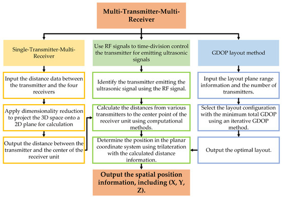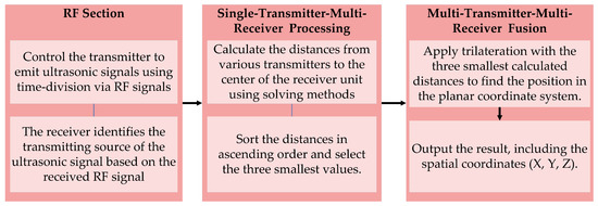 This study focuses on the design and development of a high-precision indoor positioning system, which integrates multiple transmitters and receiver units to form a multi-transmitter-multi-receiver network architecture, akin to satellite positioning systems. The objective is to attain precise positioning with an error margin of no more than 5 cm within a confined indoor setting. The overall process flow is depicted in Figure 4.