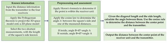 In the model involving multiple transmitters and a single receiver, common methods include trilateral positioning, triangulation, and maximum likelihood estimation. The trilateral positioning algorithm is favored for its simplicity and computational ease, providing accurate position coordinates when ultrasonic ranging is precise. The maximum likelihood estimation method, while effective in minimizing systematic errors, can suffer from increased algorithmic complexity, potentially leading to slower system response times. The triangulation method, which relies on angle measurements, can be difficult to implement in practical scenarios. For systems with multiple ultrasonic beacons, the approach prioritizes selecting the three nearest beacons and applying the trilateral positioning method to achieve effective indoor localization. The calculation flow for this integrated system model is depicted in Figure 6.