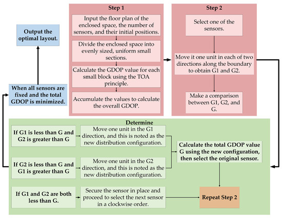The solution process is illustrated in Figure 7. The GDOP factor is a crucial metric for evaluating the spatial relationships between sensor transmitters and receivers in an indoor positioning system. GDOP measures how the positional relationship between the target and the sensors affects overall positioning accuracy. By calculating the GDOP factor, one can gauge the reliability and precision of the sensor network, guiding the optimization of sensor deployment locations and quantities. This optimization enhances the accuracy and reliability of indoor positioning systems.