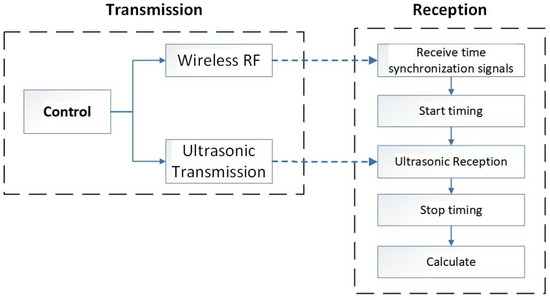 The principle of ultrasonic distance measurement is shown in Figure 8. While reflective ranging is simple and convenient, it has a notable limitation: it cannot reliably verify if the detected target is the intended one. To address this limitation, we utilize radiation-based ranging. This approach generally employs specialized ultrasonic transducers. The process for radiation-based ranging is as follows: The main control unit initiates the emission of ultrasonic waves and concurrently transmits a time-synchronized radio frequency (RF) signal. Once the receiver detects the synchronized RF signal, it starts timing and halts when the ultrasonic signal is received. The distance between the transmitter and receiver is calculated by multiplying the speed of sound by the time interval measured. This technique provides precise distance measurements between devices, thereby effectively identifying the target object.We define the measured distance as