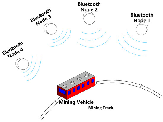 As depicted in Figure 2, Bluetooth beacons are strategically placed every 10 m along the track to provide rough positioning and to signal the system when to transition into the ultrasonic range. A custom-developed ultrasonic algorithm is then employed for precise correction. Given the inherent limitations of Bluetooth positioning and its tendency to accumulate errors, an ultrasonic system is deployed to mitigate these issues. This system corrects cumulative motion errors, accurately determines the target’s orientation, and ensures stable and precise positioning. Simultaneously, an inertial navigation module is utilized to optimize the trajectory, enabling position tracking and trajectory mapping within the mine. This integration supports machinery operation monitoring and enhances personnel safety.