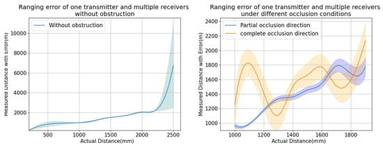 Compared to the traditional single-transmitter-single-receiver model, which typically maintains ranging accuracy within 10 mm to 50 mm under no-occlusion conditions, this model experiences significant offset and error issues under partial occlusion. In contrast, the multi-receiver model’s accuracy decreases by approximately 5% to 10% under no occlusion, but it remains relatively stable in various occlusion scenarios. Although this approach sacrifices some range accuracy, it enhances the system’s anti-interference capabilities and overall robustness in complex environments, effectively addressing the limitations of the traditional model under partial occlusion. However, neither model performs effectively under complete occlusion. To overcome these limitations, future work will focus on developing a multi-transmitter-multi-receiver system to address the challenges of ranging under complete occlusion conditions.