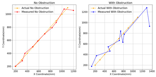 According to the ranging data, the measurement error increases progressively near the edge of the coverage area. In an unobstructed environment, the ranging accuracy remains within 100 mm. However, in the presence of occlusion, the positioning function may fail completely due to the lack of ranging data in a single direction, leading to significant bias in the overall positioning results. In contrast, the multi-transmitter-multi-receiver system demonstrates strong resistance to multipath interference in occluded environments. It can provide relatively accurate positioning results even under complete occlusion, maintaining positioning accuracy within an acceptable range.