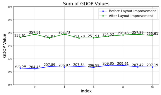 Sum of GDOP values for reference points before and after layout improvement.