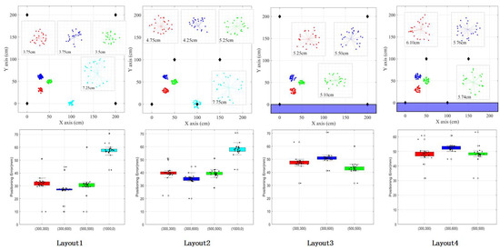 To ensure adequate coverage, four ultrasonic beacons were placed within the 2 m × 2 m area at predefined coordinates. For experimental accuracy, four distinct points within the environment were selected, and measurements were conducted four times for each layout configuration.