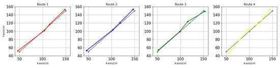 Next Steps: To further validate system performance, a dynamic positioning experiment will be conducted using Layout (1) (GDOP improvement, free space). The experiment will involve recording real-time position data of the receiving end during irregular movements and comparing this data with the actual position to evaluate the system’s navigation accuracy. The positioning roadmap for this experiment is illustrated in Figure 17. Different colors represent different paths of multiple measurements.