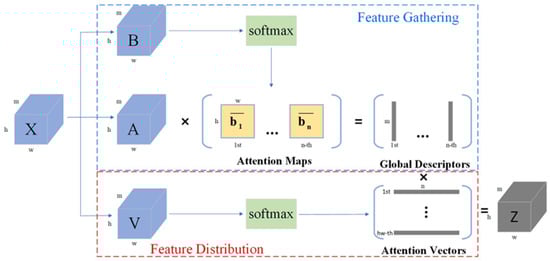 A2-Nets: The A2-Nets (double attention networks) [15] attention mechanism offers a new approach to improving traditional attention mechanisms by better capturing the relationships and dependencies between different regions in an image, thereby improving feature representation and model performance. It achieves this through two branches, and its network structure is shown in Figure 2 as follows: the first, a feature-gathering branch, collects features from the entire space using a second-order attention pool, while the second, a feature-distribution branch, adaptively selects and allocates features from this collection to each location via another attention mechanism.