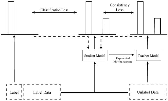 The mean teacher method is a semi-supervised learning strategy that harnesses unlabeled data to significantly improve model generalization and robustness []. Compared to traditional semi-supervised learning approaches, the mean teacher approach employs a teacher model to enhance supervision, thereby reducing the generalization error and improving the model performance; the architecture of the mean teacher model is shown in Figure 1.