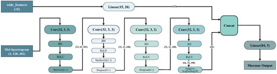 This lightweight convolutional neural network architecture is specifically designed for processing audio data, particularly for identifying cardiac murmurs. The primary input to the model is a Mel-spectrogram with dimensions of (1, 128, 401), where 128 represents the frequency dimension and 401 represents the time dimension. Additionally, the model receives an auxiliary input called “wide features”, which is a 15-dimensional feature vector. This vector is processed through a linear layer to transform it into a 20-dimensional feature.