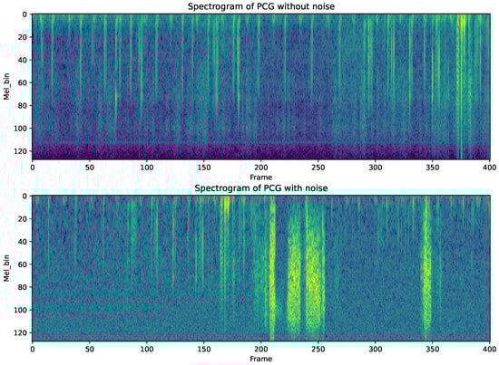 (Top): Mel-spectrogram of original PCG, (Bottom): Mel-spectrogram of PCG with Noise.