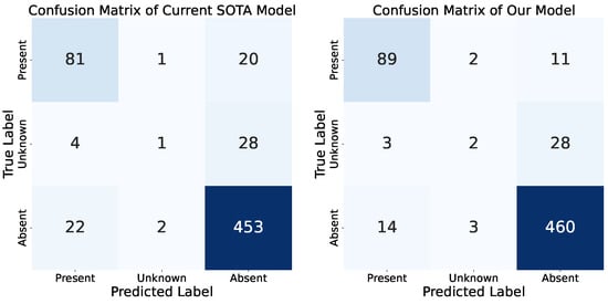 Comparison of the confusion matrix between the current SOTA model and our model.