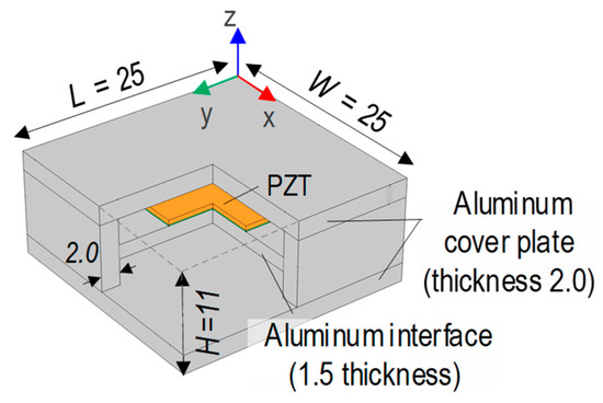 The selected PZT material is PZT-5A due to its sensitivity in damage detection [31]. The aluminum interface plate, the so-called vibrating plate, is a flexible aluminum plate with fixed ends to the CSA’s wall (thickness 2 mm). The vibrating plate identifies the sensitive frequency band of the PZT sensor [32]. The PZT sensor is attached to the interface via an epoxy glue layer (i.e., bonding layer) with a size of 10 × 10 × 0.1 mm. The aluminum cover plates are adhered to the walls to shield the PZT sensor during the CSA-embedded concrete fabrication process.