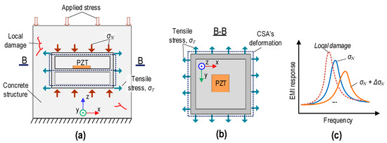 When the compressive stress acting on the CSA is increased along the z-direction, this makes the vibrating plate (see Figure 3b) expand in the y-direction and x-direction. The expansion of the vibrating plate leads to changes in the structural impedance. Therefore, increasing the applied stress in the CSA-embedded concrete structure could lead to a rightward shift in EMI responses (see Figure 3c).