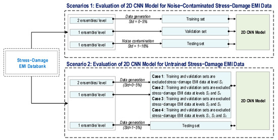 As shown in Figure 4, two scenarios are established to deal with the above-mentioned issues by evaluating the performance of a stress estimation and damage identification integrated 2D CNN model. In Scenario 1, the effect of noise-contaminated stress–damage EMI data on the robustness of the proposed 2D CNN model is evaluated. To construct the training set, Gaussian noise with standard deviations of 0%, 1%, 2%, 3%, 4%, and 5% of the stress–damage EMI amplitude is added to the first two ensembles (among four ensembles) in each applied stress level. The third ensemble tracks the overfitting status [36] during training. To construct the testing set, the last ensemble at each stress level is added with different noise levels ranging from 1% to 16% in 1% increments.