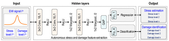In Stage 2, a 2D CNN deep learning model integrated with regression and classification layers is developed for automatically processing stress–damage EMI signals. With each input of the stress–damage EMI response into the model, the model simultaneously outputs the concrete stress estimation through the regression layer and concrete damage identification through the classification layer. This integrated approach leverages the powerful feature extraction capabilities of the 2D CNN model to decode complex patterns induced by the damage existent in EMI signals, providing a comprehensive assessment and maintenance for concrete structures.