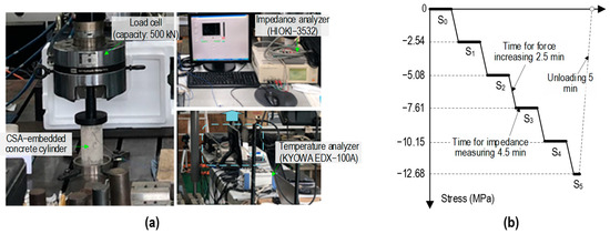 As shown in Figure 7b, six loading scenarios (S0 = 0 MPa to S5 = 12.68 MPa in steps of 2.54 MPa) were implemented in the CSA-embedded cylinder. Stress was applied in constant increments, with 2.5 min for stress increases and 4.5 min for EMI monitoring. The loading rate was consistently maintained at 0.0113 MPa·s−1.