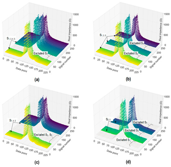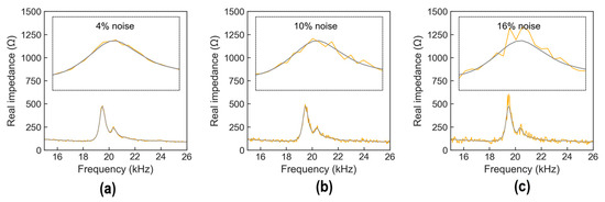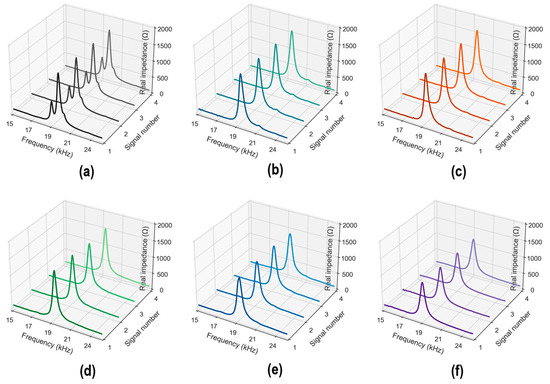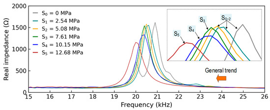 Figure 8 shows the measured stress–damage EMI responses of the z-CSA sensor under applied stress levels S0–5. In each stress level, four EMI measurements (four ensembles) were repeatedly recorded in a frequency range of 15–26 kHz. As shown in Figure 8a, four EMI ensembles under applied stress S0 were plotted. The peak of ensembles was captured clearly under a frequency range of 15–26 kHz. For increasing stress levels, the stress–damage EMI’s resonant peak frequency and real magnitude varied significantly (see Figure 8b–f).