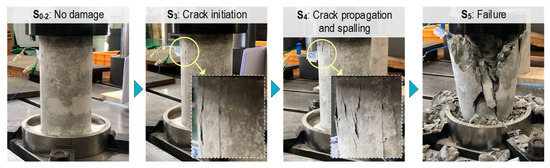 The damage levels in the test specimen under applied stresses S0–5 are shown in Figure 10. Crack imitation was found at loading level S3. Crack propagation and concrete spalling were observed at loading level S4. Then, the concrete damage developed and failed at loading level S5.
