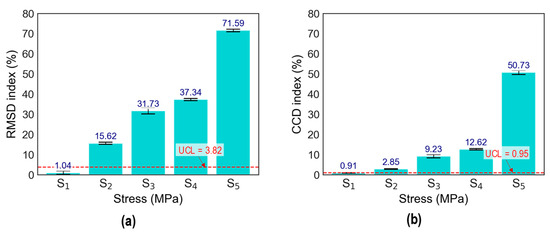 The stress–damage EMI responses of the z-CSA-embedded concrete cylinder under compressive tests were utilized to calculate stress–damage EMI features (RMSD and CCD [41]). The first stress level S0 (at 0 MPa) was neglected in EMI feature computation due to the uncertainty effect in experimental measurements. The upper control limit (UCL) threshold was established to aid decision-making. The UCL threshold was computed from three standard deviations of the mean, corresponding to a 99% confidence level. Any EMI features above the UCL indicate changes in the applied stress level.