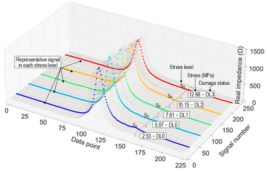 Figure 12 shows a visualization of the stress–damage EMI responses as labeled in the training set. In the figure, each EMI signal was plotted with 225 data points. Corresponding to each stress level, there were 10,800 data points. As a result, 54,000 data points were obtained corresponding to 5 stress levels. Figure 13 shows an example of noise-contaminated stress–damage EMI signals under stress level S1 in a testing set.
