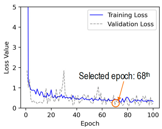 As given in Equation (1), the loss function for the regression layer, Lreg, is used to calculate the prediction error in terms of stress. Here, n is the total number of data. The parameters and represent the predicted and actual stress values for the ith data point. The loss regression value (Lreg) indicates the error in stress monitoring with the MPa unit.
