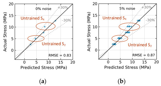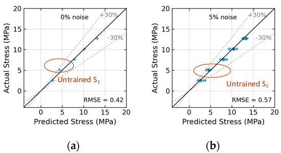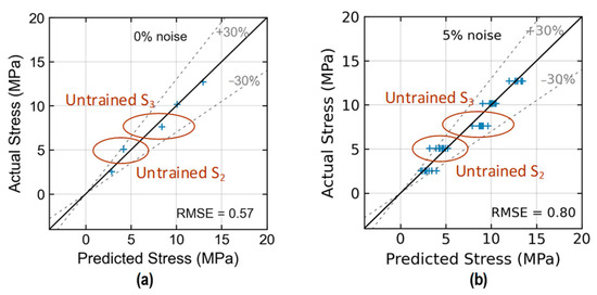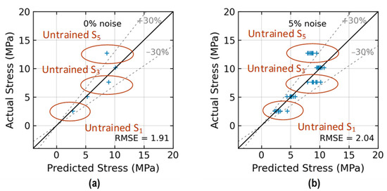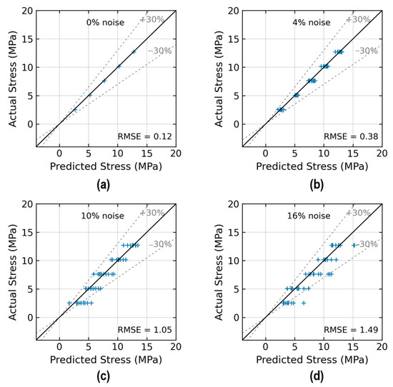 As given in Equation (2), the regression accuracy of the trained 2D CNN model was evaluated by using the root-mean-square error (RMSE) index. The RMSE calculates the average squared difference between predicted stress and actual stress . The RMSE with a unit of MPa represents the accuracy of stress prediction.