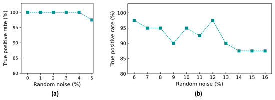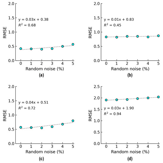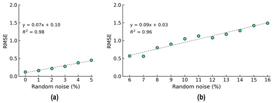 The influence of noise levels on the proposed 2D CNN model’s performance was monitored through the training, validation, and testing datasets generated from the stress–damage EMI data (see Figure 4). For the compressive test on the cylinder, the EMI signal was repeatedly measured four times (four ensembles) in each applied stress level. In total, 20 signals were acquired from 5 applied stress levels. To construct the training set, the first two ensembles (among four ensembles) in each applied stress level were added Gaussian noise levels with standard deviations of 0%, 1%, 2%, 3%, 4%, and 5% of the stress–damage EMI amplitude. For each stress level, stress–damage EMI signals were generated four times. As a result, there were a total of 240 signals (2 signals × 5 stress levels × 6 noise levels × 4 times) for 5 applied stress levels. The third ensemble was utilized to construct the validation set, and there were five total signals in the validation set. To create the testing dataset, the last ensemble in each applied stress level was added noise levels from 1% to 16% with 1% increments. For each stress level, 10 new signals were generated. As a result, we generated a total of 800 EMI signals for the 16 noise levels. Combined with the 5 original EMI signals, this resulted in a testing dataset of 805 signals (5 signals × 16 noise levels × 10 times + 5 original signals).