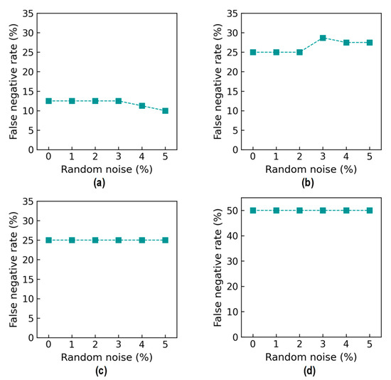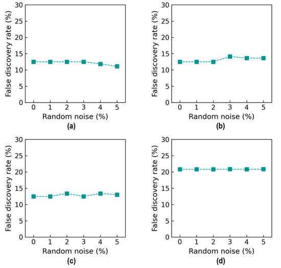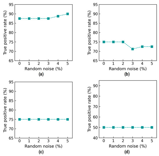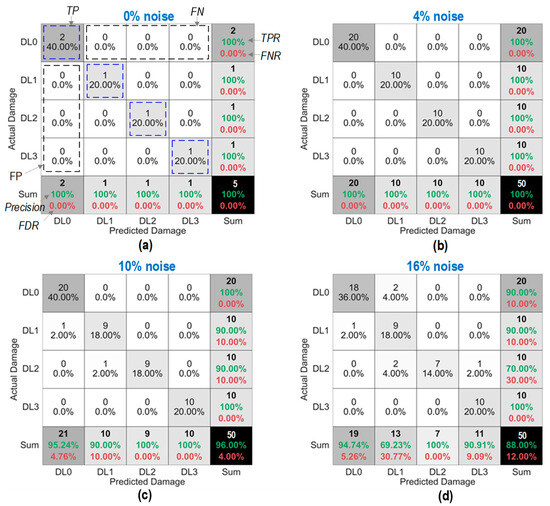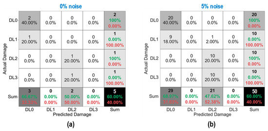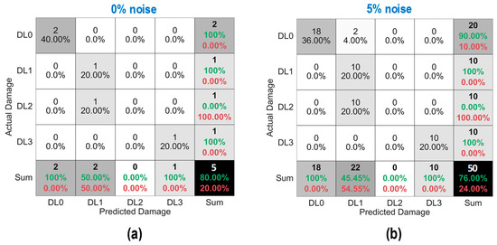 Figure 37 shows the probability assessment of the damage identification results for Case 3 (untrained S2, S3). The stress levels S2 (a part of damage level “DL0”) and S3 (damage level “DL1”) were excluded from the training dataset. Figure 37a shows the probability assessment for partially untrained “DL0”. With 0%, 3%, and 5% noise, all prediction results indicated that the damage level belonged to “DL0”. Figure 37b shows the probability assessment for untrained “DL1”. With 0% and 3% noise, all prediction results indicated that the damage level belonged to “DL2”. With 5% noise, the green-shaded region indicated that the damage level belonged to “DL2”. The model mistakenly identified “DL2” as “DL1” because the untrained EMI features from damage level “DL1” had a high similarity to those from damage level “DL2”.