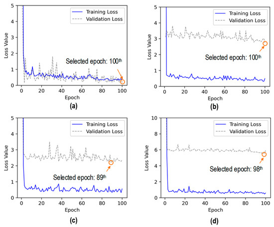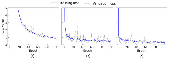 Training and validation loss of three 2D CNN architectures: (a) M1; (b) M2; (c) M3.