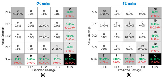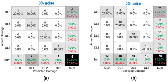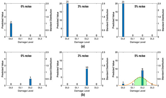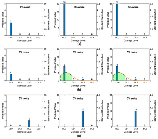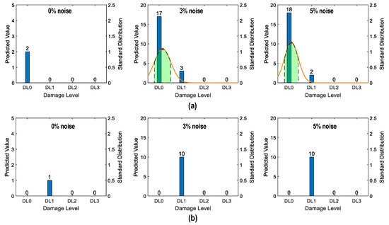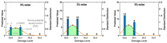 Figure 36 shows the probability assessment of the damage identification results for Case 2 (untrained S2, S4). The stress levels S2 (a part of damage level “DL0”) and S4 (damage level “DL2”) were excluded from the training dataset. Figure 36a shows the probability assessment for partially untrained “DL0”. At 0% noise, all prediction results indicated that the damage level belonged to “DL0”. Their normal PDF chart was not displayed. With 3% and 5% noise, the green-shaded region indicates that the damage level belonged to “DL0”.