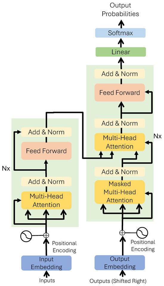 - Vaswani, A.; Shazeer, N.; Parmar, N.; Uszkoreit, J.; Jones, L.; Gomez, A.N.; Kaiser, L.; Polosukhin, I. Attention Is All You Need. arXiv 2023, arXiv:1706.03762. [Google Scholar]